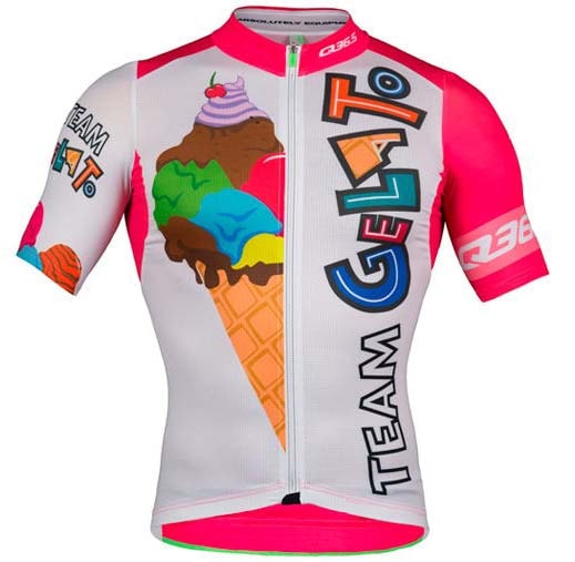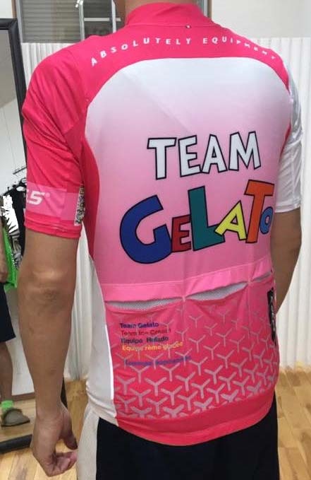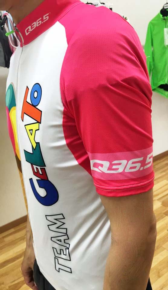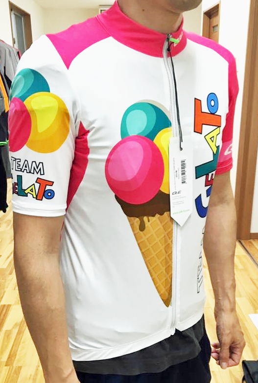 遊び心たっぷり。ヴィヴィットなピンクが目を引くカラフルでポップなイメージのジャージ。このデザイン、実はちゃんと意味があってデザインされています。昔、サイクルレースが最も盛んだったころ、イタリアではいろんなジェラート会社がスポンサーをしていてとても華やかなフロートが出たりフェスがあった、、、、。その時代を懐かしむサイクリストたちが多くいるそうです。その気持ちから生まれた限定デザイン。