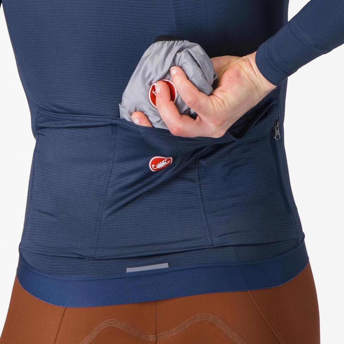 カステリの透湿性の高い製品には耐久撥水加工(DWR)が施されています。アウター生地が水分を含まない状態を保つことで、製品が本来の透湿性を発揮。仮にアウター生地が水分を含み始めた場合、撥水性能が低下するだけでなく、透湿性が最大70%低下します。