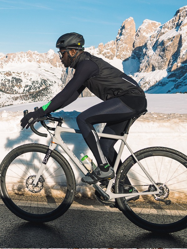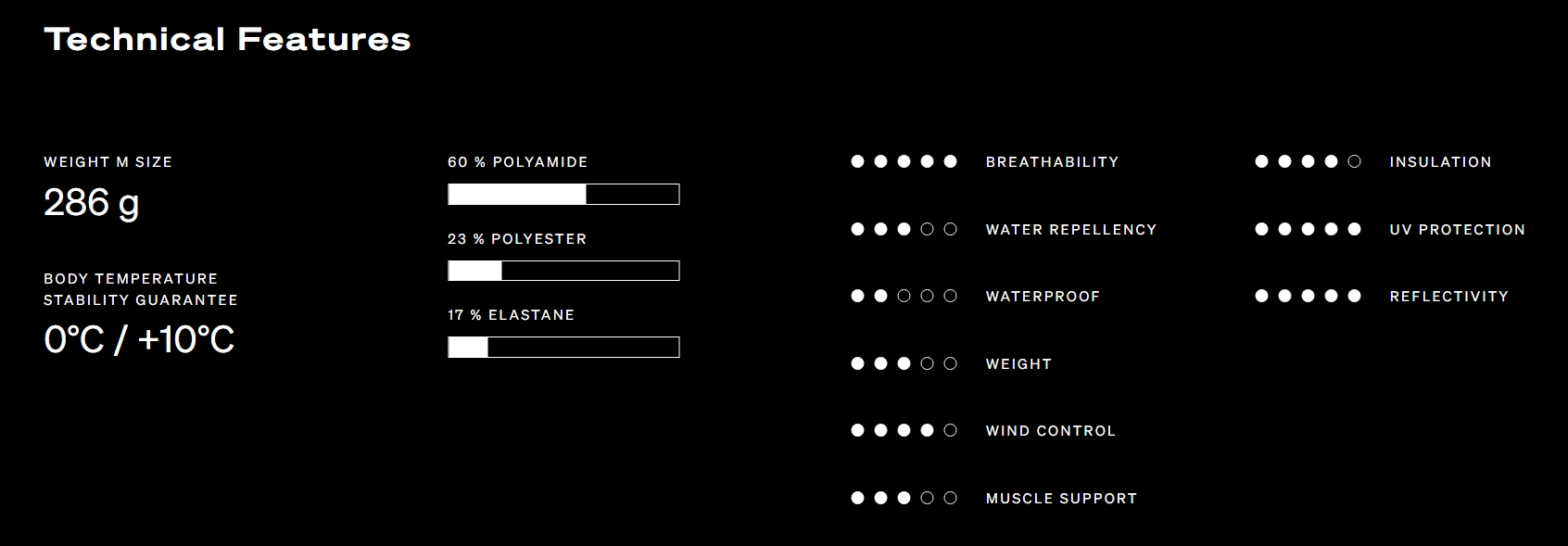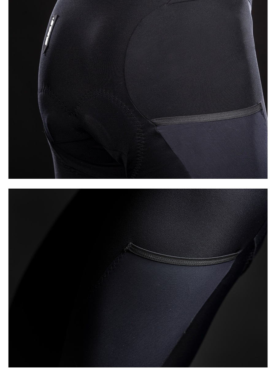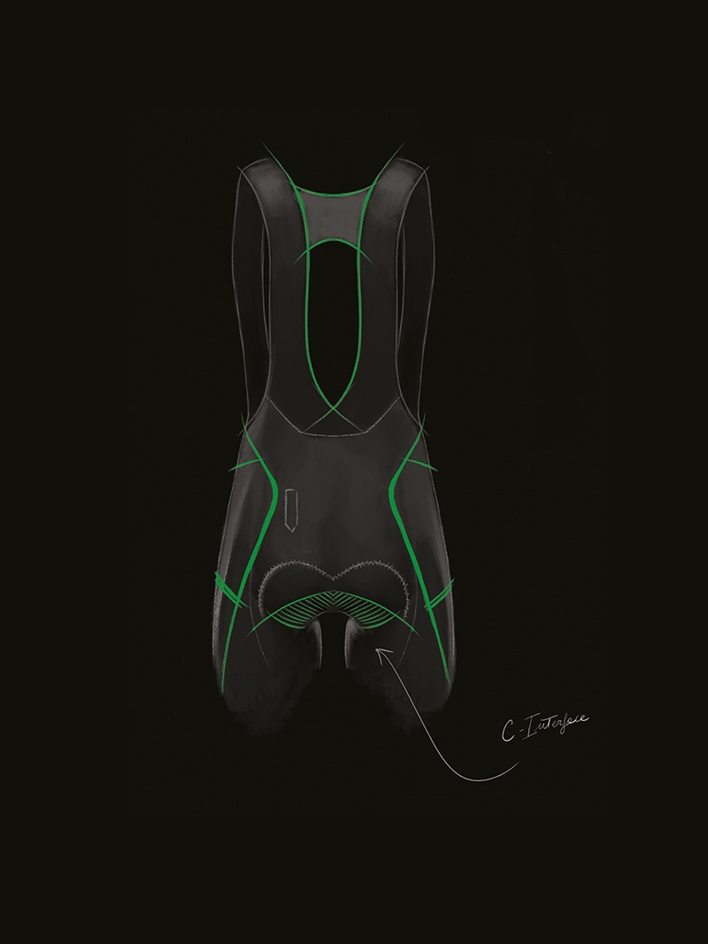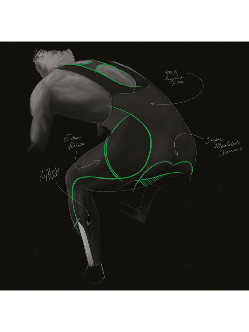 耐久性のある撥水処理を施した100%リサイクルマイクロフリース生地のみで作られています。大腿四頭筋と膝にパワーメッシュインサートを導入し、2番目の外部レイヤーを作成しました。クラッシュ時には、生地の空気層の保護ポケットにより、メッシュが生地の上を滑って皮膚の摩擦を防ぎます。両面構造の新しい独自のコンパクトニット生地です。断熱性を最適にし、内面はマイクロフリース、外面は優れた撥水性があります。股部分は、構造の再設計により、圧力により不快感を引き起こす中央の縫い目を排除する革新的なパターンカットになりました。新しいパターンは、サドルの接触面を複製し、さまざまなタイプのサドルに自然に適応するUFハイブリッドシェルファブリックで作られています。これにより、銀糸の導電性により耐久性と温度調節が向上します。ふくらはぎには反射性インサートを使用することで道路上での安全性が向上し、レーザーカットにより快適性も向上しています。