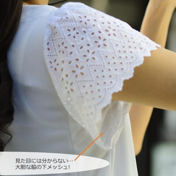 脇の下は大きくかつ目立たないようにメッシュ生地を使い通気性にもこだわりました。