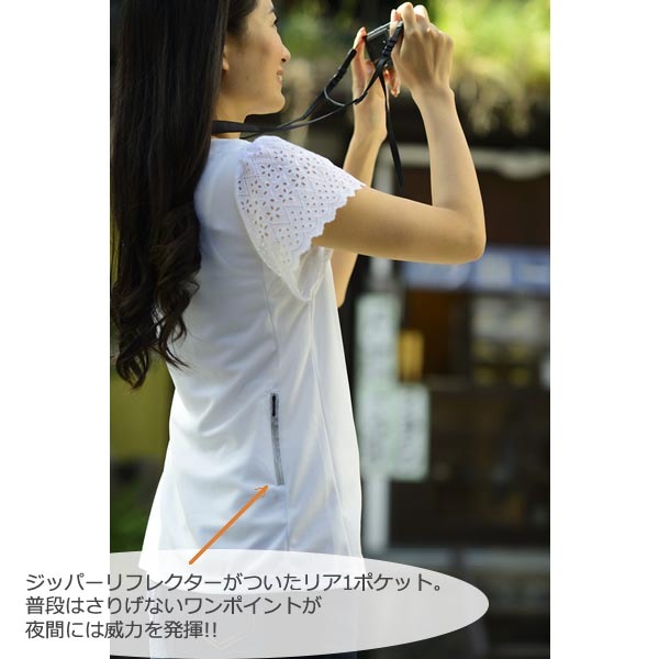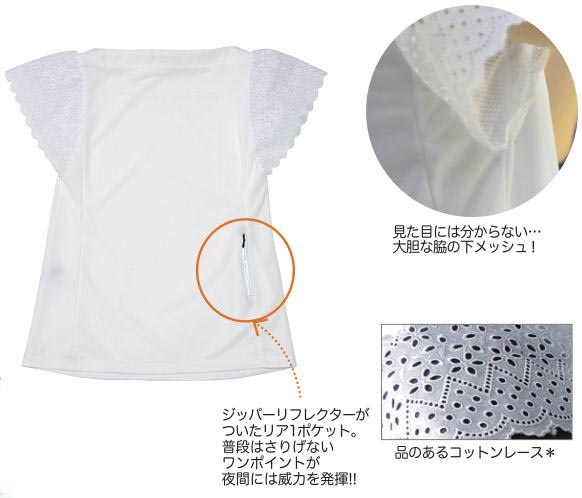 「会社にも着ていけるような可愛いジャージが欲しい」「とにかくコットンレースが好き!」という女性の意見から生まれました。TPO に合わせた自分らしいスタイルで自転車を楽しみたいもの。コットンレースのフレアスリーブをサイクルジャージに取り入れ、オフィスでもマッチし自転車に乗った時にも快適な吸汗速乾・UV カット性素材で通気性よく仕上げました。胴回りは身体のシルエットを綺麗に見せるAラインのカッティングなので、女性らしいデザインに仕上がっています。無地でシンプルだから、清楚で大人な雰囲気。あなた次第でコーディネイトのバリエーションを豊富に楽しめます。
