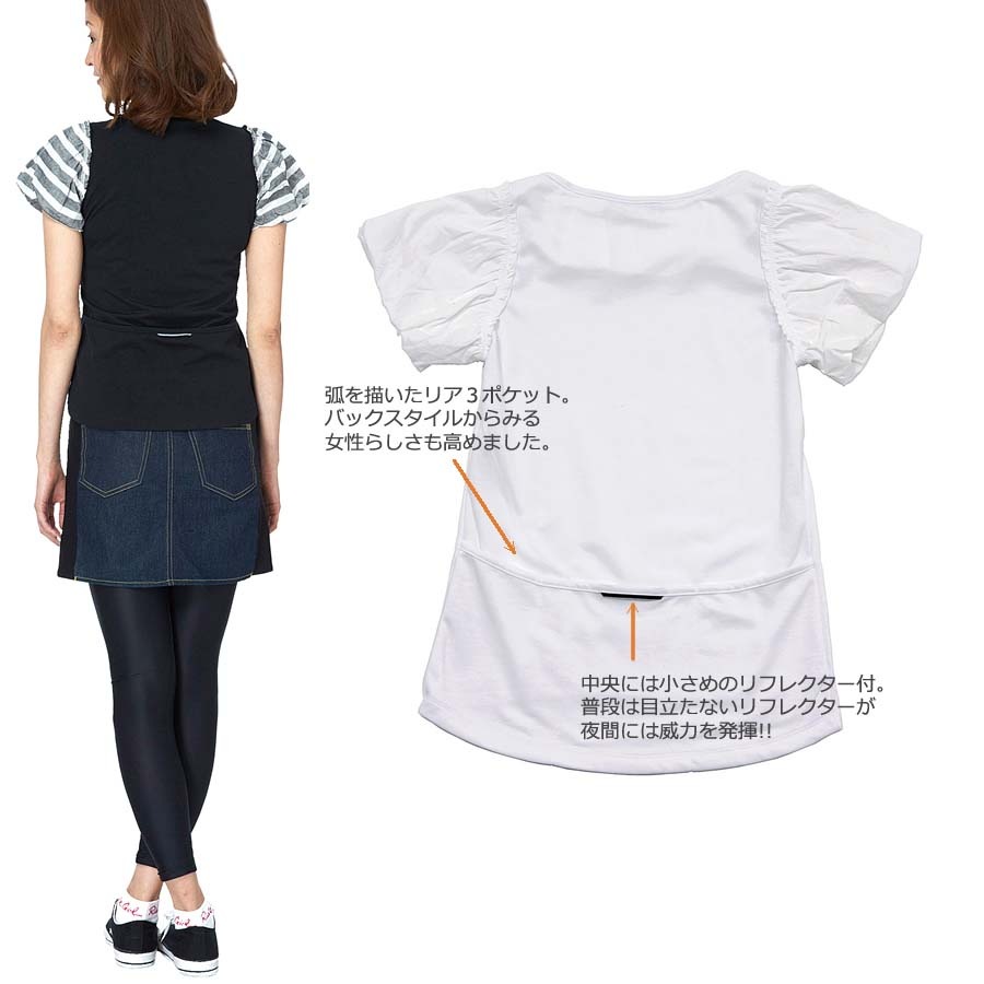 大き目のパフと女性らしいボディラインが出るデザインで小顔効果が期待でき、隠した襟は汗をかいた時の背中の汗止めにもなります。リアポケットのラインを曲線にすることでバックスタイルからみる女性らしさもたかめました。