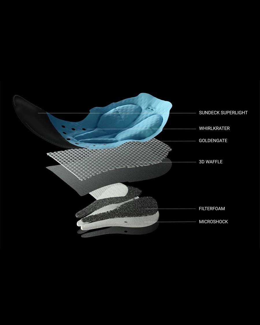 10mmの低密度マトリックスフォームをマイクロショックと3Dワッフルの間に挟み込み、微小振動を完全に吸収。また、オープンセル構造により、余分な水分を排出します。