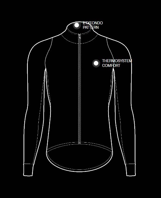中低温および小雨に対応する高性能サーマルジャージ。フリーカットスリーブと保温機能に優れ、透湿機能に優れるサーモシステムコンフォート生地は適度な筋肉へのコンプレッション機能を持ちます。