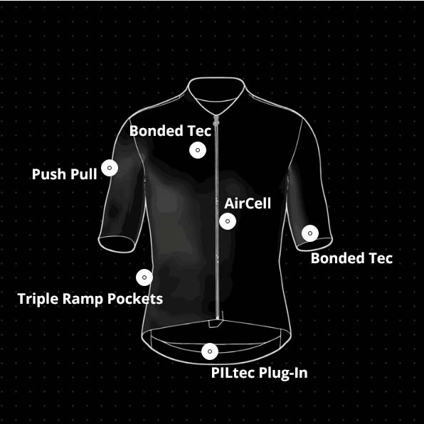 PILtecプラグイン:後裾には軽量で超通気性のテキスタイルバンドとマイクロドットシリコン加工を施し、ジャージのバックパネルを安定させ、濡れた状態でもグリップ力を維持する。