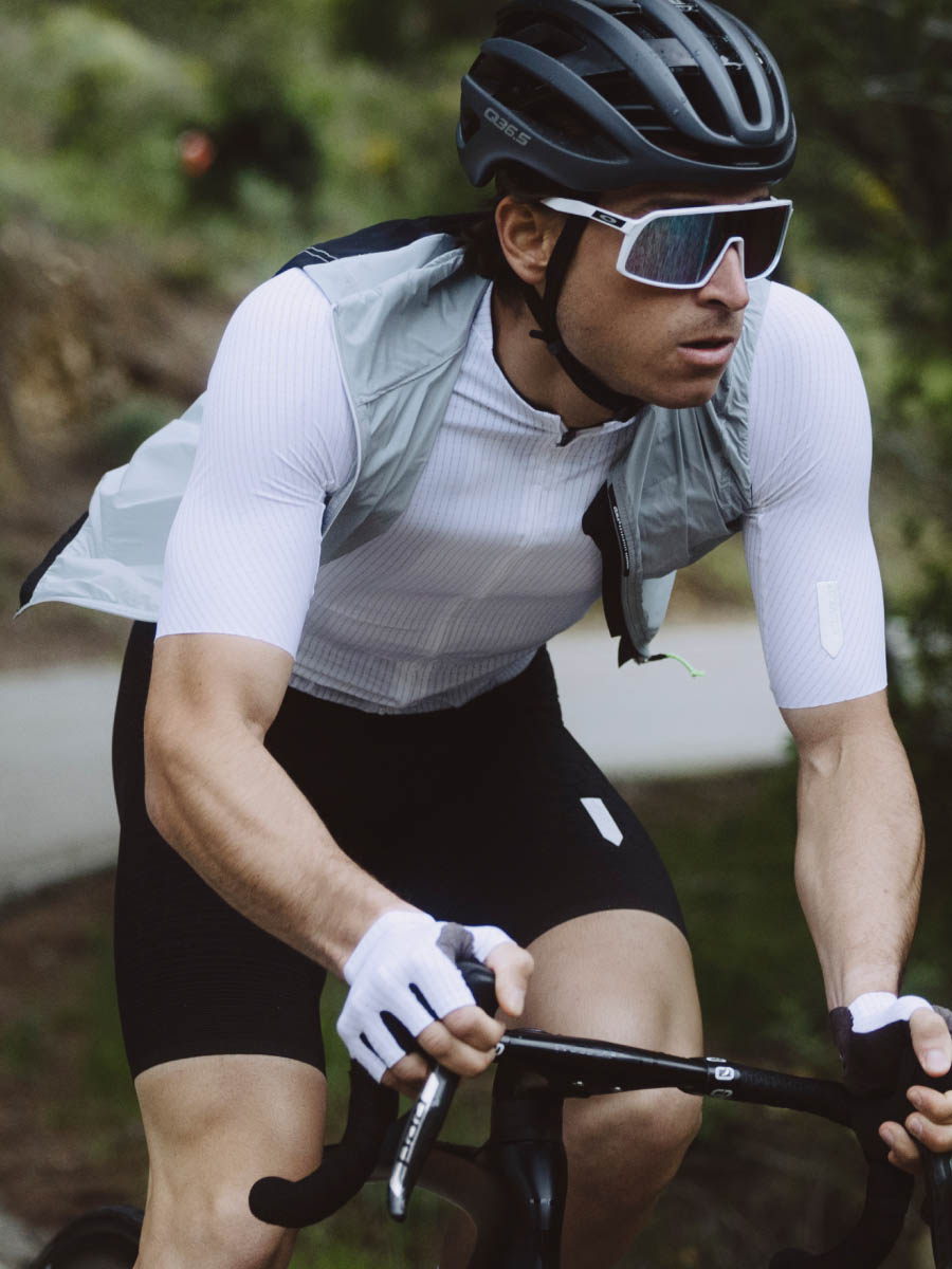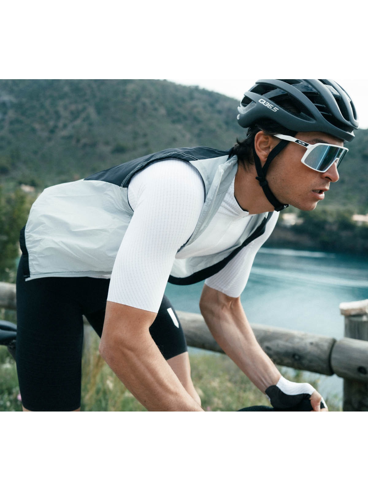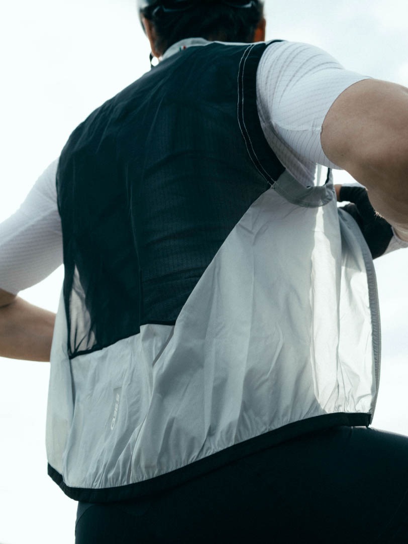 超コンパクト設計 で、ジャージのバックポケットに簡単に収納可能。気温が下がったり湿度が上がる場面に備えて、常に携帯できるアイテムです。前面パネルは完全防風仕様 で、高山のダウンヒルでも冷気をシャットアウト。一方、背面にはメッシュ素材を採用 し、効率的な換気を実現。さらに 耐久性撥水加工(DWR) により、小雨や霧の影響を軽減します。