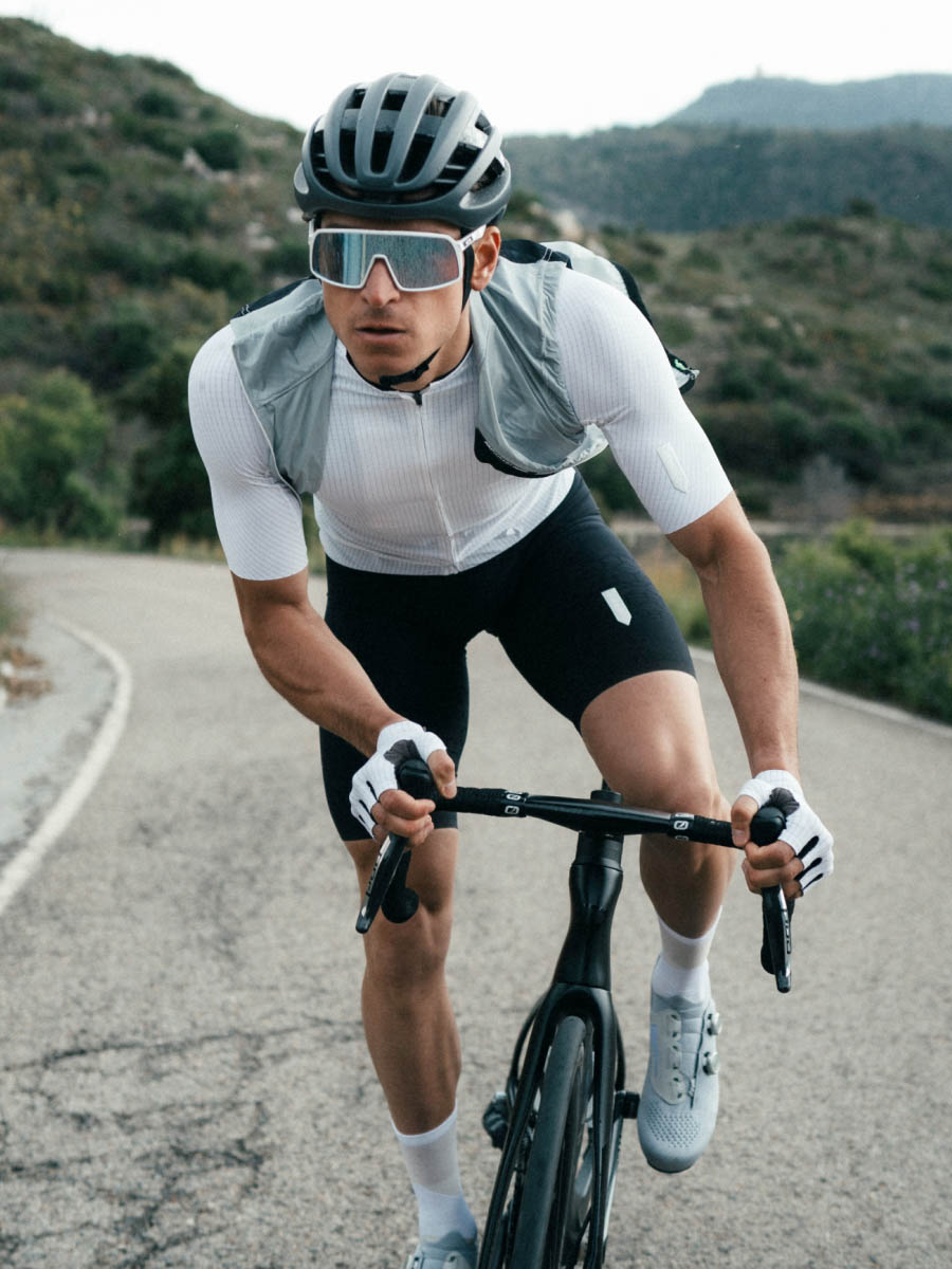 ベストは エルゴノミックフィット を採用し、縫い目を最小限に抑えた空力設計 でバタつきを防止。プレシェイプド構造と 4ウェイストレッチ素材 により、動きやすさも抜群です。
