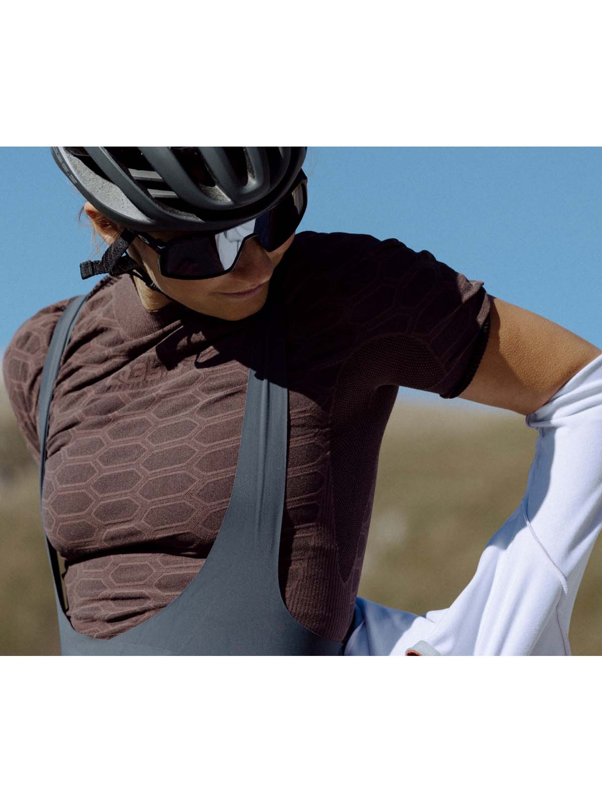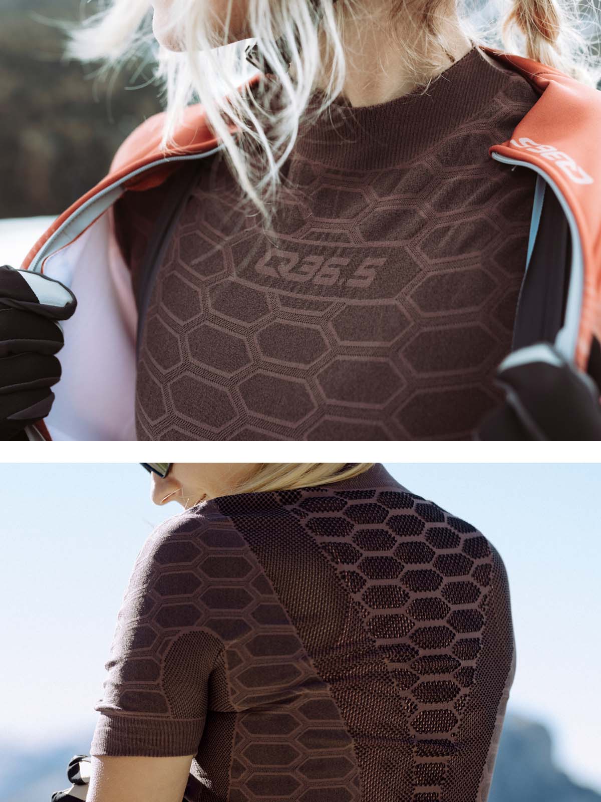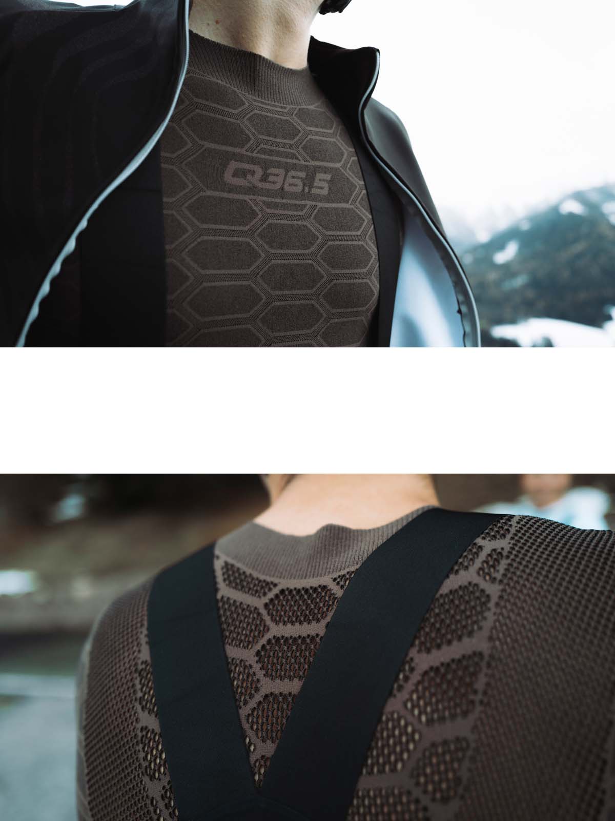 ハニーカムパターンのニットは、様々な密度で展開され、オープンメッシュの部分と合わせて、アスリートの体の熱要求と地域の発汗量をマッピングしています。これにより、最高のライダーの快適性と保護を実現するだけでなく、可能な限り製品の体積を大幅に削減することができました。その結果、驚くほどピュアでミニマルなベースレイヤーが完成しました。重量は87g(目的ではなく設計上の結果)で、15℃以上で使用するのが最適です。