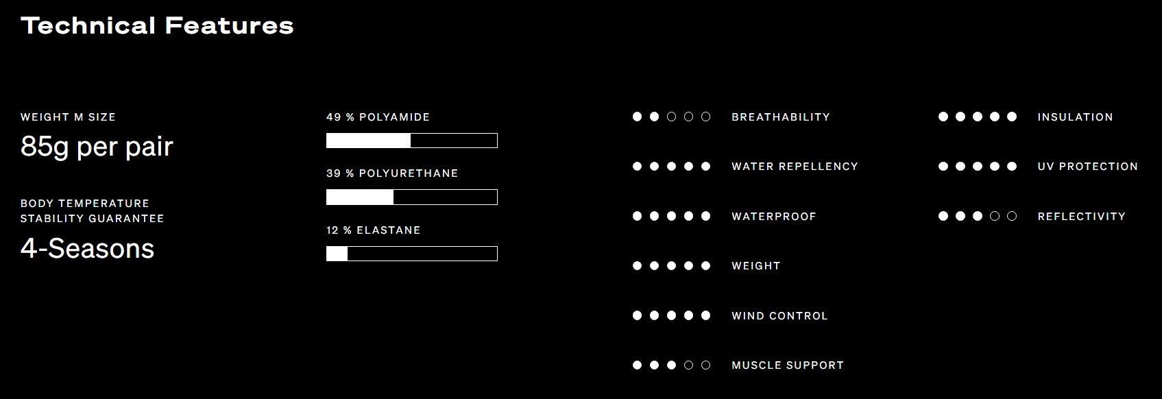 Q36.5のRain OvershoesおよびToecoversに使用されているファブリックは、内側・外側の両面にポリウレタン防水加工を施したニットテキスタイル。柔らかな肌触りと優れた伸縮性を兼ね備えたこの素材は、製造技術も含めて市場で唯一の存在です。シリコン製オーバーシューズと同等の防水性能を持ちながら、特有の欠点を排した理想的なソリューションです。