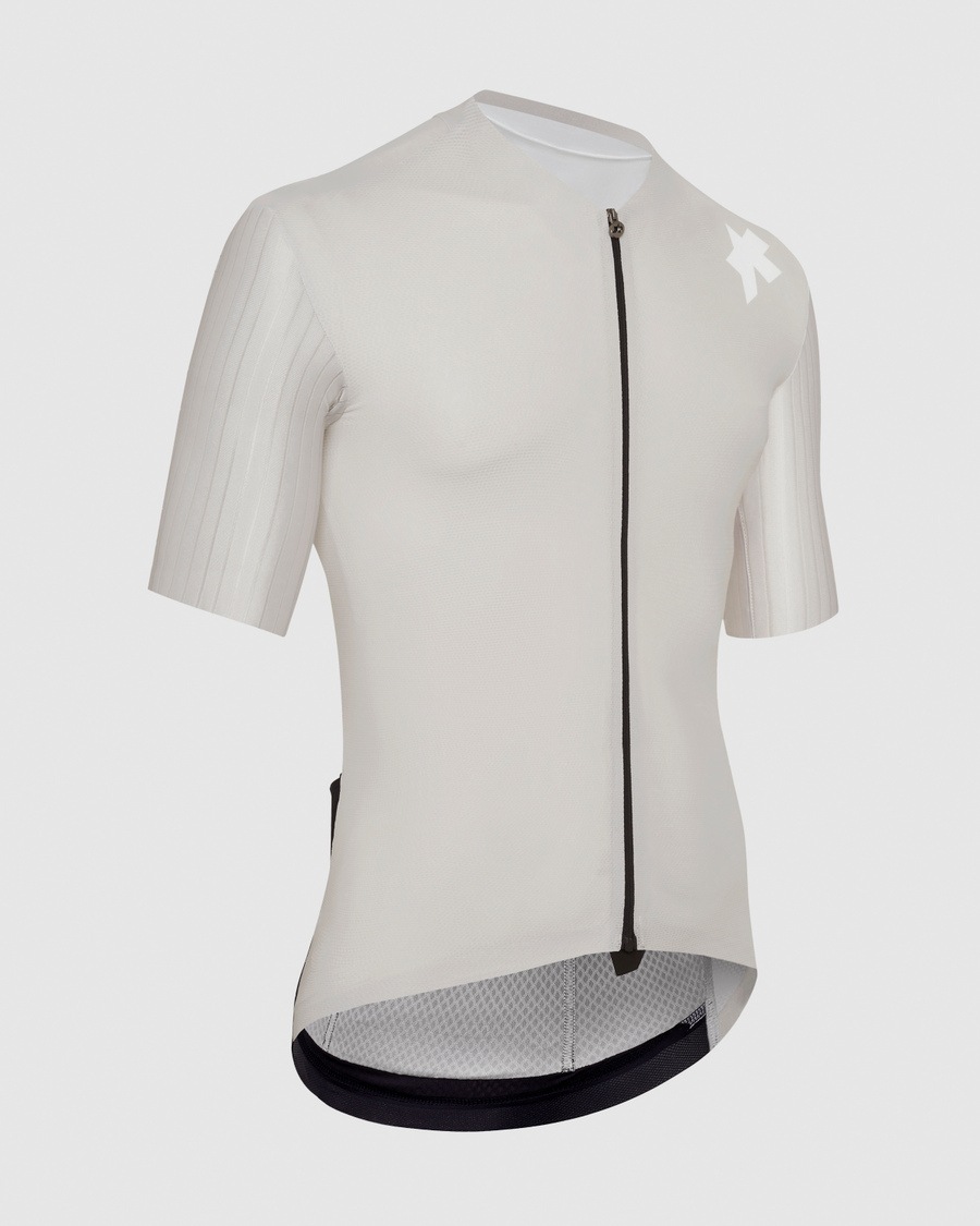 ASSOSのワールドツアー・ショートスリーブ・レースジャージは、腕全体がより空力的にフィットするように再設計され、全体的に冷却性と通気性が向上し、全体的に軽量化されている。