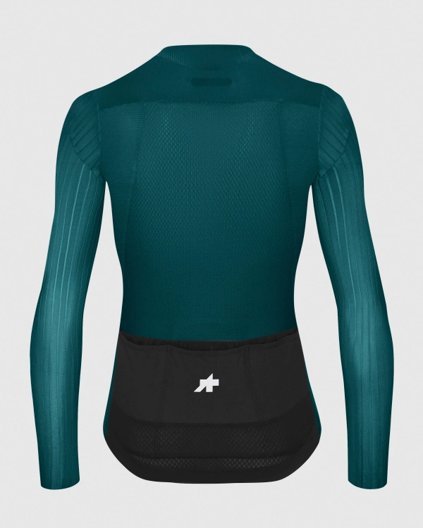 open 3D ニット構造の miniCheck Tex は、高い通気性と伸縮性、UPF 25 の紫外線防護、そして ASSOS ジャージ特有の質感をフロント全体に与えます。ポケットは Stabilizer V11 のリアパネルで支えられ、強力な冷却性と通気性を備え、UPF 15 と非常に軽量なため、その下には日焼け止めの使用を推奨しています。このパネルは荷物を入れた際の沈み込みや揺れを防ぎ、安定性を高めます。ロングスリーブには新しい 550CX ワープニットテキスタイルを採用し、UPF 35 の保護性能と、筋肉を包み込むバイストレッチフィット、そして本質的なエアロ特性を備えています。
